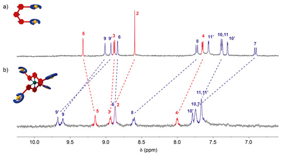 1H NMR spectra (400 MHz, 300 K) in DMSO-d6 of: (a) tweezers 1 and (b) [Zn(1)2]Cl2.