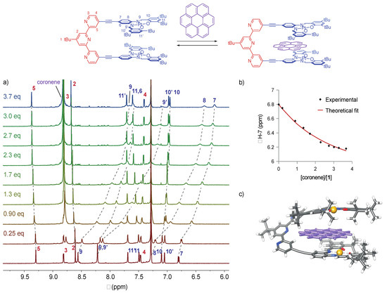 The recognition and intercalation abilities of tweezers 1 towards flat aromatic guest molecules were then investigated by analogy with bis(Pt-terpyridine) molecular clips, which have been reported in the literature [8,9,40,42]. Titration experiments were monitored by 1H NMR in CDCl3 at 300 K. Upon addition of coronene, large upfield shifts for phenylene H-7, H-8 and H-6 protons (Δδ of ca. −0.6 to −0.9 ppm) as well as H-9 and H-9′ imine protons (Δδ of ca. −1.1 ppm) were observed (Figure 7a), which are probably due to the π-stacking interactions between the salphen moiety and the coronene. In addition, the signal of coronene was also shifted upfield by approximately 0.2 ppm. The protons of the terpyridine unit, H-3 and H-4, are less affected. Only the H-5 and H-2 protons showed a small downfield shift (Δδ of ca. +0.1 ppm), indicating weak interactions between the coronene and the terpyridine unit. These shifts are consistent with recognition taking place inside the cavity formed by the two Pt-salphen units. Upon lowering the temperature in CD2Cl2, the broadening of the NMR signals was observed for a 1:1.5 mixture of 1 and coronene, with a coalescence that was reached at around 220 K (Figure S6). At 190 K, two sets of signals were observed for all peaks, which indicates the transition from a fast to slow exchange upon cooling. Since the major set of signals have the same chemical shifts as the free tweezers at 190 K, the minor ones can be attributed to the host/guest complex.
