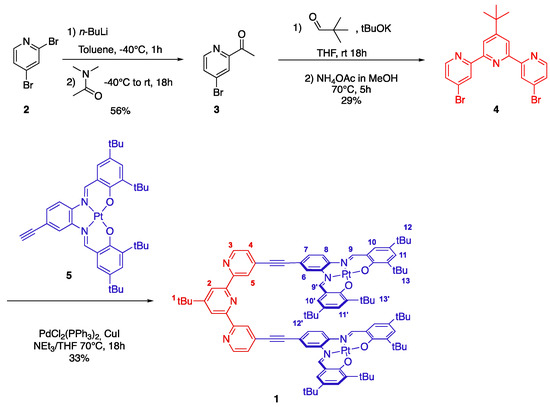The synthesis of tweezers 1 is based on a modular approach, which uses a double Sonogashira coupling reaction between 4,4″ substituted di-bromo-terpyridine 4 and alkyne substituted Pt(II)-salphen complex 5 as a key step (Scheme 1). Since Pt(II)-salphen complexes are inert, they can be used as building blocks in cross-coupling reactions, which enables the control of the coordination sphere of the two different salphen and terpyridine ligands. The synthesis of the 4,4″ substituted terpyridine started from 2,4-dibromopyridine 2, which was acetylated by a regioselective lithium halogen exchange reaction with n-butyllithium followed by a reaction with N,N-dimethylacetamide [43]. After hydrolysis and purification by column chromatography, 3 was obtained in 56% yield. The terpyridine ligand 4 was then synthetized using a one-pot Hantzsch-type procedure [44]. Actetyl-pyridine 3 was reacted with pivalaldehyde in the presence of potassium tert-butoxide as base in THF to form an intermediate diketo product, which was subsequently cyclized by ammonium acetate and oxidized by air. After purification by column chromatography on neutral aluminum oxide, 4,4″-dibromoterpyridine 4 was obtained in 29% yield.