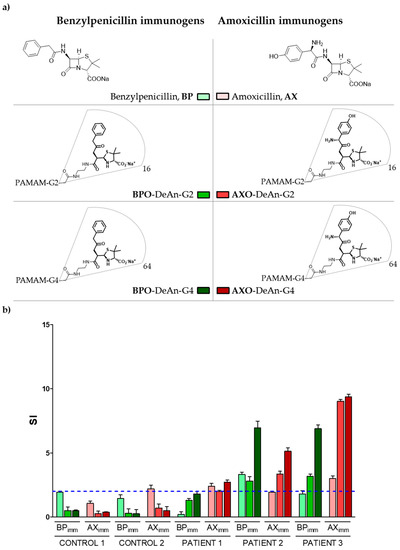 Immunogen structures and BAT results: (a) Chemical structure of the series of immunogens evaluated: the free drugs, BP and AX; DeAn-G2 decorated with BPO (BPO-DeAn-G2) or AXO (AXO-DeAn-G2) and DeAn-G4 decorated with BPO (BPO-DeAn-G4) or AXO (AXO-DeAn-G4); (b) Evaluation of BAT performed with different immunogens related to BP and AX: individual BAT results expressed as SI of each structure for patients and controls. BAT represents the mean of five determinations plus the mean + SEM (Standard Error of the Mean).