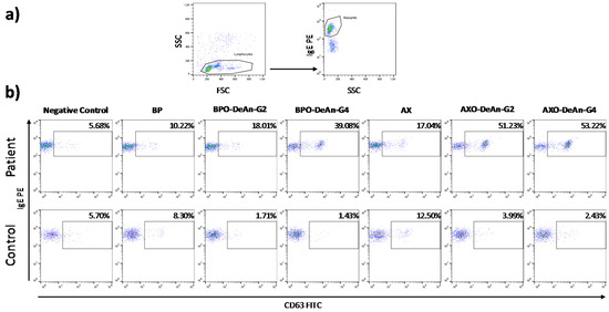 Basotest (Orpegen Pharma, Heidelberg, Germany) was used following the manufacturer’s recommendations and previous procedures [26]. Briefly, 100 µL of heparinized whole blood was incubated with stimulation buffer for 10 min at 37 °C in a water bath. After this, 100 µL of the washing solution was added to the negative control tube and fMLP (chemotactic peptide N-Formyl-Met-Leu-Phe) to the positive control tube. Samples were incubated with two immunogen concentrations: BP at 2 and 0.5 mg/mL; AX at 1.2 and 0.25 mg/mL and DeAns at 1 and 0.1 mg/mL (chosen on the basis of previous dose–response curves and cytotoxicity studies). The samples were incubated for 20 min at 37 °C in a water bath. The degranulation was stopped by incubating the samples on ice for 5 min and then 20 µL of staining reagent containing two monoclonal antibodies, anti-IgE PE and antigp53 FITC (gp53 is a glycoprotein expressed on activated basophils), was added to each tube and incubated for 20 min in an ice bath covered to prevent exposure to light. The cells were analyzed in a flow cytometer by acquiring at least 1000 basophils per sample. Results were considered as positive when the SI, calculated as the ratio between the percentage of degranulated basophils with the different haptens and the negative control, was greater than two to at least one of the dilutions mentioned above. When the percentage of spontaneously activated basophils was less than 2.5%, the percentage of basophils activated after contact with the antigen should be equal to or greater than 5%. The BAT selection strategy of representative samples for a patient and a control is shown in Figure 2.