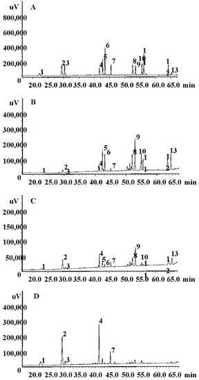 HPLC chromatograms of mixed standards (A); notoginseng processed by the microwave processing method at 500 W and 150 °C for 20 min (B); notoginseng steamed at 120 °C for 4 h (C) and raw notoginseng (D). Peaks: 1, notoginsenoside R1; 2, ginsenoside Rg1; 3, ginsenoside Re; 4, ginsenoside Rb1; 5, 20(S)-ginsenoside Rh1; 6, 20(R)-ginsenoside Rh1; 7, ginsenoside Rd; 8, ginsenoside Rk3; 9, ginsenoside Rh4; 10, 20(S)-ginsenoside Rg3; 11, 20(R)-ginsenoside Rg3; 12, ginsenoside Rk1; 13, ginsenoside Rg5.