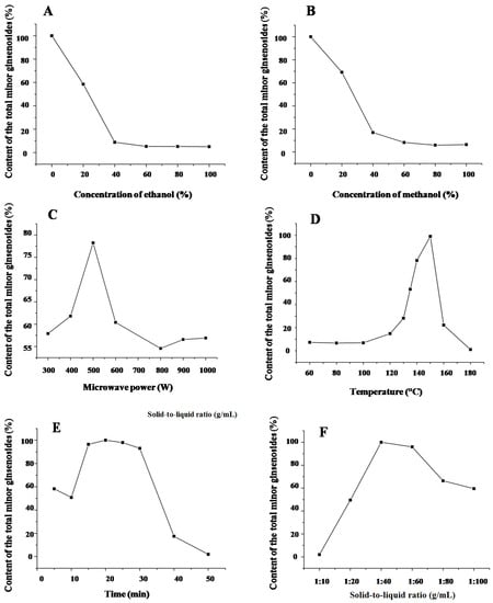 Effect of solvent, microwave power, temperature, time and solid-to-liquid ratio on production of the total minor ginsenosides. (A) Ethanol concentration; (B) Methanol concentration; (C) Microwave power; (D) Microwave temperature; (E) Microwave time; (F) Solid-to-liquid ratio.