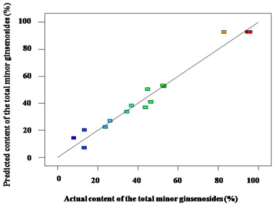 The ANOVA results (Table 3) showed that the total model for production of the minor ginsenosides (Y1–Y9) was highly significant, with a p value of <0.001, while the lack of fit is not significant relative to the pure error, with a p value of >0.05. Hence, this model could be used for predicting all points. Figure 3 further shows that the actual values of total minor ginsenosides (Y9) were very similar to the predicted values. The fitting degree of the model was checked by regression coefficient (R2 = 0.9766), and this is in agreement with the adjusted R2 value of 0.9466.