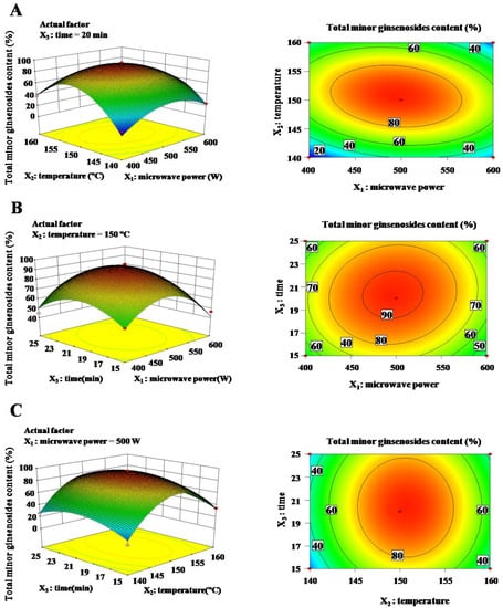 Response surface plots and contour plots for production of the total minor ginsenosides using interaction of variables. (A) Effect of microwave power (X1) and temperature (X2) on total minor ginsenosides content (Y9) at time 20 min; (B) Effect of microwave power (X1) and time (X3) on total minor ginsenosides content (Y9) at temperature 150 °C; (C) Effect of temperature (X2) and time (X3) on total minor ginsenosides content (Y9) at microwave power 500 W.