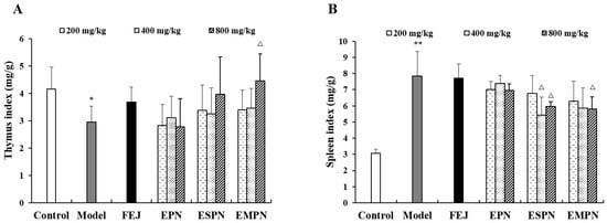 Spleen or thymus index (mg/g) = (spleen weight or thymus weight/body weight)