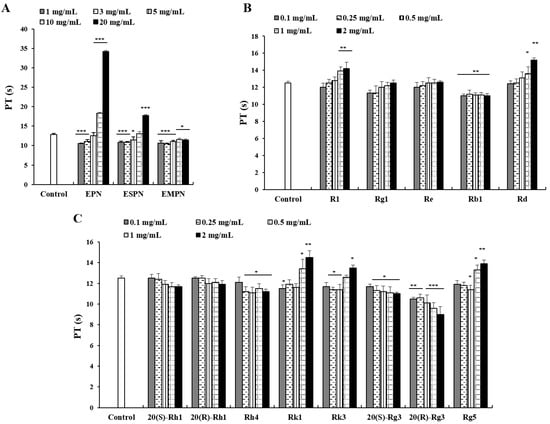 Prothrombin time (PT) was measured using a coagulation analyzer (XN06-IV, Aierfu, Wuhan, China). The plasma was obtained from mice whole blood added with 0.109 mol/L sodium citrate (9:1 ratio of blood to citrate) by centrifugation at 1000× g for 15 min. The mixtures of the plasma (50 μL) with EPN, ESPN, EMPN or their compounds (50 μL) were incubated at 37 °C for 3 min. The samples of EPN, ESPN and EMPN were diluted with purified water to give the five concentrations: 20, 10, 5, 3, 1 mg/mL. The ginsenosides Rg1, Rb1, Re, Rd, 20(S)-Rh1, 20(R)-Rh1, Rh4, Rk1, Rk3, 20(S)-Rg3, 20(R)-Rg3 and Rg5 and notoginsenoside R1 were diluted to other five concentrations: 2, 1, 0.5, 0.25, 0.1 mg/mL. The PT assay reagent (100 μL) was added to the mixed samples and the clotting time was recorded. Purified water was used as negative control.