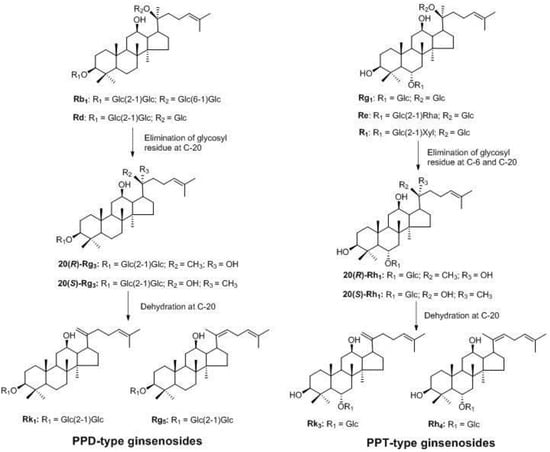 The root of Panax notoginseng (Burk.) F. H. Chen is a well-known traditional Chinese medicine in China and around the world. Traditionally, raw notoginseng is commonly used in the treatment of trauma and blood circulation, while the steamed notoginseng can enrich the blood [1,2]. Both of them are not only different in treatment function, but also different in chemical composition. So far, more than 100 dammarane-type saponins have been isolated and identified from raw notoginseng, five major components of which are respectively ginsenosides Rg1, Re, Rb1, Rd and notoginsenoside R1 [3,4,5]. However, more than 50 new components are produced by dehydration, hydroxylation or epoxidation of the main saponins in the raw notoginseng after hydrolysis of the C-20 sugar moiety by the steaming process [6,7,8]. Eight minor ginsenosides of the steamed notoginseng—20(S)-Rh1, 20(R)-Rh1, Rh4, Rk1, Rk3, 20(S)-Rg3, 20(R)-Rg3 and Rg5—are less polar compounds [9,10,11]. These minor ginsenosides cause the functional differences between raw and steamed notoginseng.