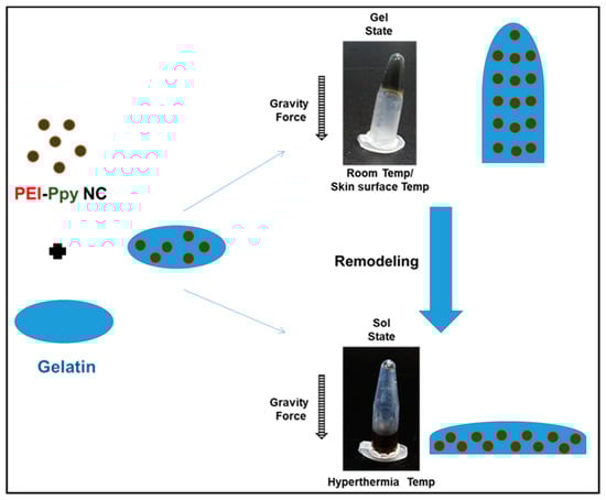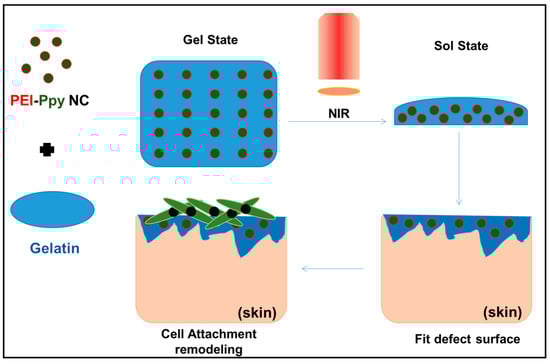 Polypyrrole (Ppy) is considered one of the useful conductive polymeric materials because of its numerous unique features, for example, stability of the chemical structure and higher electrical conductivity in aqueous mixtures [2]. Because of various biological requirements, the biocompatibility of Ppy has been studied previously. Numerous cellular and animal studies findings verified that Ppy derivatives are biocompatible with living systems and are free of any noteworthy injurious or inflammatory responses after long-term use [3]. Chemically, polypyrrole is a polymerized form of aromatic pyrrole monomer rings [4]. The pyrrole monomer is soluble in numerous distinctive kinds of aqueous phases and in chemical solvents, but Ppy is hydrophobic owing to an inflexible complexed backbone, and thus lacks appropriate functions for further biological applications [5]. To produce Ppy polymers from pyrrole monomers, oxidation and other chemical or electrochemical procedures have been used [6]. Currently, nanobiomaterials are being used in biomedical fields due to their similarities to biomolecules in terms of smaller dimensions; interestingly, nano-based biomaterials show a greater intracellular internalization as compared with micron-dimensional particles, making them excellent candidates for targeted drug delivery systems, such as those working toward targeting cancer cells and other specific sites [7], thus making them useful for many biomedical applications based on the functionality of nanobiomaterials and their interactions with the surrounding tissues. Recently synthesized Ppy nanoparticles can provide better structural properties and electrical conductivity for biomedical applications. Furthermore, polyethylenimine (PEI) is one of the most popular cationic polymers used in delivery systems [8], and could be formulated with Ppy for the production of stable Ppy nanoparticles. However, the use of PEI has been limited because of its possibly high hemotoxicity, cytotoxicity, and slow biodegradability at high-molecular-weight levels, confirmed by in vitro studies [9]. Low-molecular-weight PEIs have found to have better biocompatibility if there are chemical modifications [10,11] made. When combined together, PEI and Ppy, following an chemical process, may result in a PEI–Ppy polymeric nanocomplex with conductive properties [12] for extensive applications in biomedicine. PEI can also form a bridge between the Ppy and other polymeric substances such as gelatin due to its cationic nature. Gelatin has been considered as a popular polymeric biomaterial for multipurpose scientific applications [13] such as gel/hydrogel fabrication [14]. Features of gel-state gelatin are typically established by the structural changes and thermal properties in the environment [15]. Gelatin is soluble above 35 °C, but upon dropping the temperature to below 35 °C, natural thermal-reversible hydrogels are produced [16]. In this gelling process, chains of gelatin experience a transformational coil-to-helix conformation, through which gelatin manages to reverse the structure of the triple helix of ptotein [17]. It was reported previously that due to their physicochemical properties, polymeric hydrogels mimic the native extracellular matrix in skin and exhibit a high water-retaining capability, which is necessary for faster wound healing [18]. Hydrogel-constructed bioscaffolds also need to display remodeling properties over time to integrate with tissue during the healing process, and bridge with the natural extracellular matrix (ECM) of the potential patients. Solid or rigid biomaterial implants could not easily fit the shape of the contact surface of the defect [19]. Thus, the development of a hydrogel with a reversibly transformable property to fit defect surfaces would be a necessary design requirement for tissue engineering.