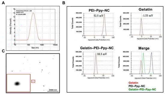 (A) Dynamic light scattering (DLS) size analysis of PEI–Ppy‒NC; (B) zeta potentials of the test samples PEI‒Ppy‒NC, gelatin, and gelatin‒PEI–Ppy‒NC; (C) TEM image of PEI‒Ppy‒NC with magnified view.