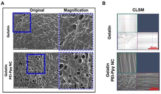 (A) Morphology and porous structure of the test sample detected by SEM: PEI–Ppy‒NC-loaded gelatin hydrogel (Gelatin, scale bar = 500 μm; PEI–Ppy‒NC-loaded gelatin, scale bar = 1 mm); (B) representative X–Z plane confocal laser scanning microscopy (CLSM) image of gelatin and gelatin containing PEI‒Ppy‒NC, showing the distribution of dark nanoparticles inside the gelatin hydrogel matrix.