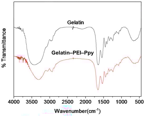 Results of the FTIR spectral analyses of the test samples of gelatin and the gel–PEI–Ppy NC hydrogel system.