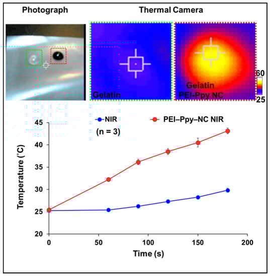 Photothermal behaviors after remote NIR irradiation were tested using a thermal camera. As a result, the thermal properties of the test hydrogel were clearly visualized, as shown in Figure 5. The temperature of the hydrogel without the PEI–Ppy‒NC was slightly elevated to 29 °C due to a lack of photothermal transduction efficiency. In contrast, after NIR treatment, temperature of the gelatin hydrogel with PEI–Ppy‒NC significantly increased to a hyperthermic temperature (43 °C) due to the presence of black Ppy conductive nanoparticles (Figure 5) [31].