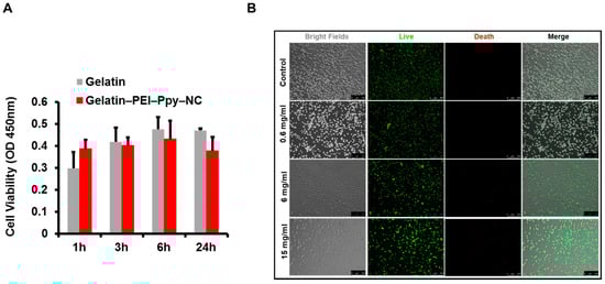 According to the indirect MTT assay result, as shown in Figure 6A, in comparison to the control group of the gelatin-only hydrogel, the experimental groups containing various concentrations of PEI–Ppy‒NC were tested to check their effect on L929 fibroblast cell lines. Interestingly, PEI–Ppy‒NC nanoparticles in gelatin hydrogel showed similar biocompatibility to gelatin hydrogel groups. Furthermore, we could not find any significant cell viability difference between all the test groups up to 24 h of the experiment. To further support the MTT assay, we performed a live/dead assay to visualize the live and dead cells after cell and hydrogel interaction for 24 h.