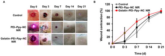 Prior to histological analysis of the wound site skin, the wound area and contraction were visualized, monitored, and captured as digital images, followed by periodical measurements at days 0, 3, 7, 14, and 21, as shown in Figure 8A. Then, the percentage of wound size contraction was calculated and graphically represented (Figure 8B) (n = 3) to evaluate the nature of wound healing in experimental groups such as the PEI‒Ppy‒NC NIR and gelatin‒PEI‒Ppy‒NC NIR groups, in comparison to the without-treatment control group. From macroscopic image observation, although at day 21, all groups of rats had shown almost complete wound closure, the gelatin‒PEI‒Ppy‒NC group showed the best results at days 3, 7, and 14. Moreover, there was significant difference between control and gelatin‒PEI‒Ppy‒NC NIR group at day 21 (p < 0.05) in terms of wound contraction percentage. Wound healing process in gelatin‒PEI‒Ppy‒NC NIR treated group had best healing without abnormal findings such as severe inflammation, necrosis, swelling, and infections due to biocompatibility of the test hydrogel.