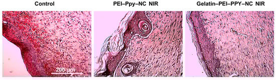 Further confirmation of wound healing capacity and local toxicity of the materials implanted at the wound site were checked by detailed histological finding analyses, as shown in Figure 9. In general, re-epithelialization, granulation tissue formation, and fibrous tissue formation are the important characteristic phenomena, with appropriate cell migration and optimal cellular infiltration and organization within the wound site promoting the wound healing process [50]. In all three groups, during the experiment, they showed various degrees of re-epithelialization, regeneration, and repair with fibrous tissue formation. Re-epithelialization was found to be prominent at the wound edges at different maturation levels. The control group showed newly formed thicker epidermis layer without keratin, while the dermis layer had free red blood cell deposition with disordered collagen fibers and few inflammatory cells, which indicates altered wound healing [51]. In case of PEI‒Ppy‒NC NIR group, higher keratinization with irregular re-epithelialization was observed. But in the case of the gelatin‒PEI‒Ppy‒NC NIR treatment group, relatively normal re-epithelialization, fibroblasts, and organized collagen fiber formation were observed showing the biocompatibility and nontoxicity of the implanted scaffold material for wound healing and skin tissue engineering applications. Furthermore, our designed scaffold has the advantage to compensate for the toxicity of the PEI–Ppy NC at the wound site through the gelatin hydrogel scaffold system for full thickness skin wound healing.