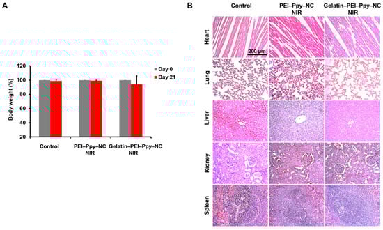 (A) Comparative body weight change (%) between day 0 and day 21 of the experiment in the control and experimental groups; (B) Histological findings of primary organs from the control and experimental Wistar rat groups’ heart, lung, liver, kidney, and spleen tissue.