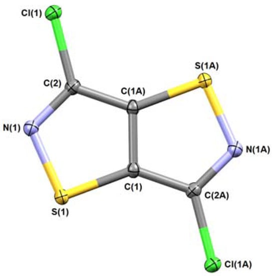 X-ray structure of 3,6-dichloroisothiazolo[5,4-d]isothiazole (8a). (CCDC 1840070). Thermal ellipsoids are at 50% probability.