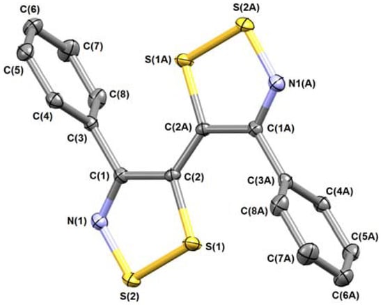 X-ray structures of (E)-4,4′-diphenyl-5,5′-bi(1,2,3-dithiazolylidene) (11b) (CCDC 1840072) (top) and 3,6-diphenylisothiazolo[5,4-d]isothiazole (8b) (CCDC 1840071) (bottom). Thermal ellipsoids are at 50% probability and hydrogens are omitted for clarity.