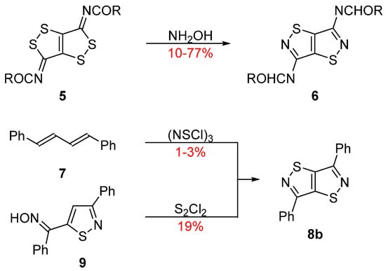 - Konstantinova, L.S.; Rakitin, O.A. Synthesis and properties of 1,2,3-dithiazoles. Russ. Chem. Rev. 2008, 77, 521–546. [Google Scholar] [CrossRef]