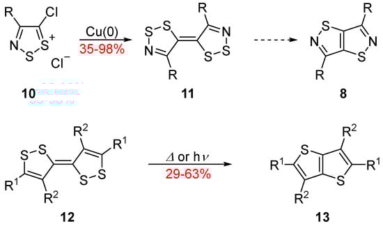 Recently, Rakitin et al. described the Cu(0)-mediated coupling of 4-substituted 5-chloro-1,2,3-dithiazolium chlorides 10 [20,21,22] to give (E)-4,4′-disubstituted 5,5′-bi(1,2,3-dithiazolylidenes) 11 [23]. Products 11 are similar to (E)-3,3′-bi(1,2-dithiolylidenes) 12 that undergo both thermal and light-mediated ring transformations to afford thieno[3,2-b]thiophenes 13 [24] (Scheme 2).