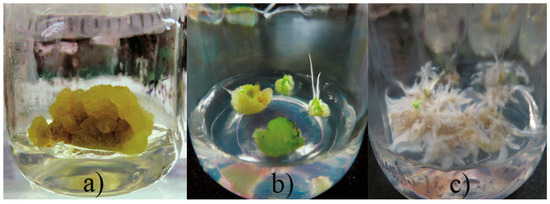 Effect of plant growth regulators on callus induction. (a) callus, (b) callus with roots, (c) roots.