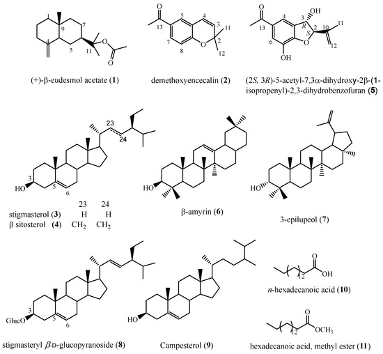 Repeated silica gel column chromatography of the bioactive extract, allowed the isolation of ten compounds (Figure 2) as described in the Experimental Section. The structures of these compounds were determined as (+)-β-eudesmol acetate (1), desmethoxyencecalin (2), the mixture of β-sitosterol (3) and stigmasterol (4), (2S,3R)-5-acetyl-7,3α-dihydroxy-2β-(1-isopropenyl)-2,3-dihydrobenzofuran (5), β-amyrin (6), 3-epilupeol (7), stigmasterol glucoside (8), campesterol (9), n-hexadecanoic acid (10) and hexadecanoic acid, methyl ester (11). The structures of compounds 1–5 and 8 were determined by comparison of their 1H-, 13C-NMR, and mass spectrometry data with those reported, while compounds 6, 9–11 were identified by GC-MS (NIST 1.7a). Compounds 3, 10 and 11 were previously reported as constituents of wild plants of A. pichinchensis, while compounds 1, 2, 4–7 have not been reported from this plant species.