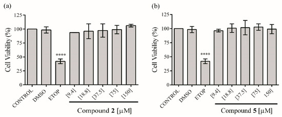 Effect of compounds 2 (a) and 5 (b) on the viability of RAW 264.7 cells. The values are expressed as the mean ± SD of three independent experiments (n = 3). Significance was determined using ANOVA followed by Dunnett’s multiple comparisons test (**** p < 0.0001 DMSO, ETOP (etoposide) and compounds compared with control group).