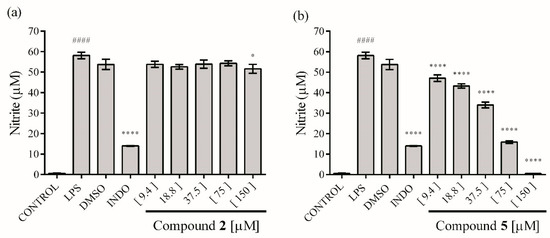Effect of compounds 2 (a) and 5 (b) on NO production in lipopolysaccharide (LPS)-stimulated RAW 264.7 macrophages. The values are expressed as the mean ± SD of three independent experiments (n = 3). Significance was determined using ANOVA followed by Dunnett’s multiple comparisons test (#### p < 0.0001 LPS compared with control group; * p < 0.05 and **** p < 0.0001 DMSO, INDO (indomethacin) and compounds compared with LPS group).