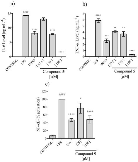 Activation of factor NF-κB is important for the pro-inflammatory response of macrophages, including IL-6 and TNF-α secretion, whereby, the ability of compound 5 to avoid this process was evaluated. We observed that this compound inhibits the activation of NF-κB, but 100% inhibition was not achieved even at 150 µM. Nonetheless, an effect associated with concentration is observed, reaching a 40% of inhibition at 150 µM (Figure 5c).