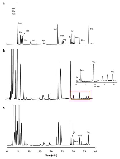 The chromatogram of (a) a standard amino acid mixture; (b) an extracted sample; and (c) a real sample spiked with a standard amino acid mixture. The enlarged section of the chromatogram in the time-window containing the three amino acids Leu, Phe, and Trp is highlighted. The Y-axis is in the mV scale.
