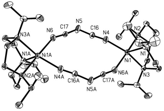 The distance from the center to the closest non-hydrogen atom of the ligand was 4.455 Å in 1, thus the inner cavity had an estimated volume of ca. 80 Å−3 (Figure 3). Note that the anion was found to have a pronounced effect on the hexanuclear structure. When we changed the anion PF6− to the larger anion BPh4− with a similar nickel complex. A similar structure could not be obtained, but a binuclear NiII complex 2 was obtained (Figure 4) []. In complex 2, the Ni ions were five-coordinated with the N(1), N(2), N(3) from L ligands and N(4), N(6) from dicyanamide ligands. Two Ni ions were bridged by dicyanamides, forming slightly distorted square-pyramidal geometry. The distances of Ni-N bonds were almost equal and amounted on average to 2.072 Å. The nearly planar dicyanamide utilized two of three possible N-donors to coordinate Ni ions, resulting in the formation of a twelve-membered, slightly puckered ring. The bond angle inside the ring, N(4)-Ni1-N(6), was 84.72(9)°. The intramolecular Ni···Ni separation was 7.386 Å.