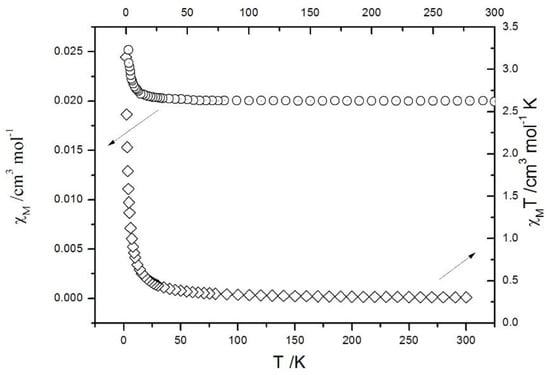 The magnetic susceptibilities were measured under a 1000 Oe applied magnetic field in the 2−300 K temperature range. As illustrated in Figure 6, the value of χmT increased with decreasing temperature from 300 K to 2 K, showing the presence of an antiferromagnetic interaction between the Cu(II) ions. The slightly ferromagnetic interactions resulted from a superexchange mechanism of adjacent Cu(II) ions. With decreasing temperature, the χmT increased slightly from 300 K to 24 K and then increased rapidly from 25 K to 2 K.