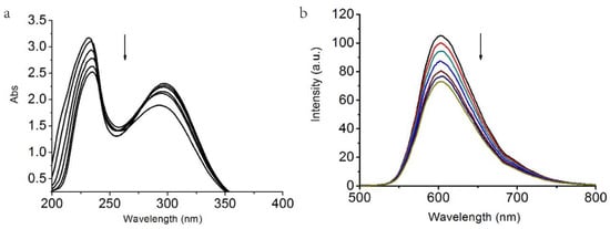 In order to investigate whether DNA was the biological target of the compound, its interactions with Calf-thymus DNA (CT-DNA) were studied by UV-Vis and fluorescence spectroscopy. CT-DNA was prepared with Tris-HCl/NaCl buffer with pH of 7.5. The absorption spectra of compound 1 with absence and presence CT-DNA at various concentrations are shown in Figure 7a. The potential CT-DNA binding ability of complexes was studied by UV spectroscopy by following the intensity changes of the intraligand π–π* transition band at 232 nm and 298 nm. Upon the addition of an increasing amount of CT-DNA (from 10−5 to 10−4 M) to the complexes (10−5 M), 20% hypochromism and slight red shift (7–12 nm) were observed, indicating that interactions between the DNA phosphate groups and Cu cations, or Cu coordination to guanine bases, might have happened.