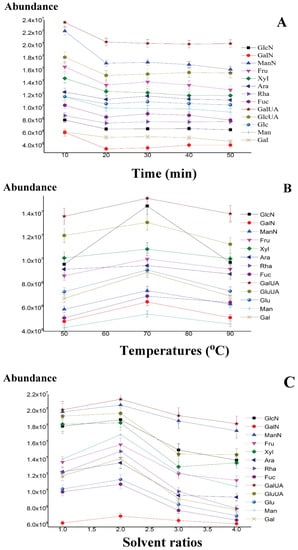 Effects of derivatization time on monosaccharide-mercaptalated (A), effects of both TMS derivatization temperatures (B), and solvent ratios between HMDS and TMCS (C) on formations of TMSDs.