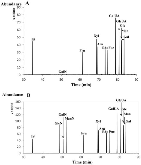 GC-MS chromatograms based on TMSD derivatives for free carbohydrates in the water extracts of A. asphodeloides (A) and full acidic hydrolysis products of G. ganoderma polysaccharides (B).