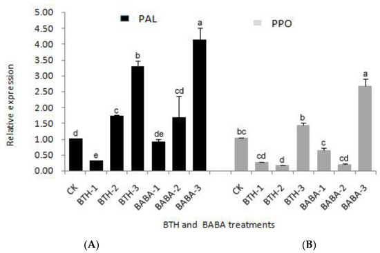 Relative Expression of PAL and PPO genes in different treatments. (A) Relative expression of PAL gene in BTH and BABA treatments. (B) Relative expression of PPO gene in BTH and BABA treatments. Note: BTH-1 (25 mg/L), BTH-2 (50 mg/L), BTH-3 (75 mg/L); BABA-1 (100 mg/L), BABA-2 (200 mg/L), BABA-3 (400 mg/L). Data are presented as Means ± SD. The error bars represent the standard deviation. Different lowercase letters depict significant differences.