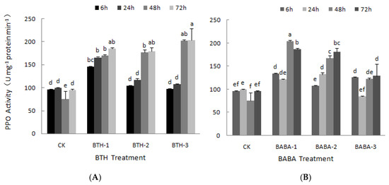 The effect of BTH and BABA on PPO was measured at different times, from 6 to 72 h after treatments (Figure 2). There was a steady increase in PPO activity over time with application of BTH-1 treatment; however, there was no significant difference in the activity (Figure 2A). The application of BTH-2 resulted in increase in PPO activity over time. There was a sharp increase in PPO activity by 51.59% from 24 to 48 h after treatments application, and then followed by a very narrow increase at 72 h (Figure 2A). This; therefore, resulted in a significant difference in PPO activity over time. The effect of BTH-3 on PPO was not different from that of BTH-2, there was no obvious difference in PPO activity at 48 and 72 h, yet the PPO activity increased by 88.24% from 24 to 48 h after BTH-3 application, which also in general led to a significant difference in PPO activity over time with the application of BTH-3 treatment (Figure 2A). These results; therefore, suggest that the effects of BTH on PPO activity, at various treatment concentrations, is largely dependent on time of exposure. However, at any given time (6, 24, 48 and 72 h), tea leaf PPO activities in BTH treatments increased above their corresponding control treatments.