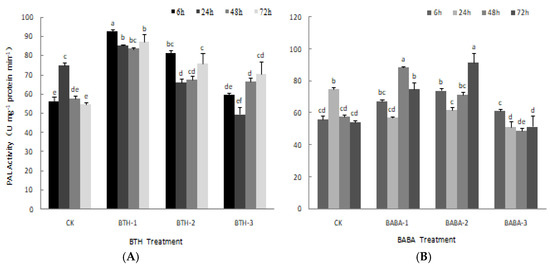The effect of BABA treatments on PAL activity did not follow similar trend as the control experiment. PAL activity decreased with all BABA treatments from 6 to 24 h after application (Figure 3B). At 48 h, PAL activity increased with different margins with BABA-1 and BABA-2, but decreased with BABA-3 application. Similarly, at 72 h, PAL activity decreased with BABA-3 application but increased at different margins with both BABA-1 and BABA-2 (Figure 3B).