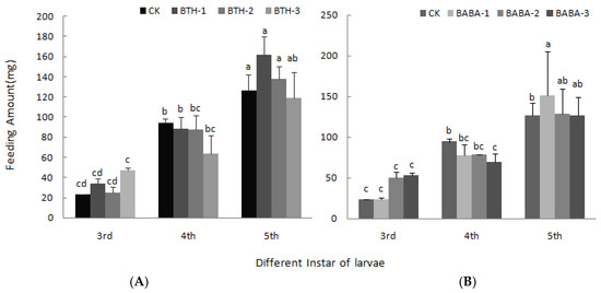Effect of BTH and BABA on feeding amount of larvae. (A) Feeding amount of larvae of BTH treatment. (B) Feeding amount of larvae of BABA treatment. Note: BTH-1 (25 mg/L), BTH-2 (50 mg/L), BTH-3 (75 mg/L); BABA-1 (100 mg/L), BABA-2 (200 mg/L), BABA-3 (400 mg/L). Data are presented as Means ± SD. The error bars represent the standard deviation. Different lowercase letters depict significant differences.