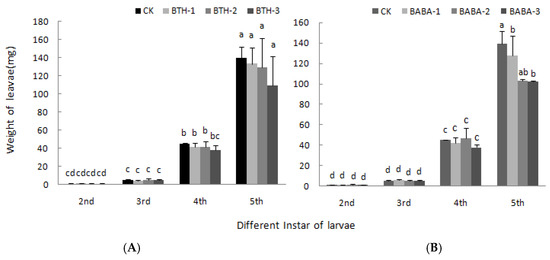 Effect of BTH and BABA on the weight of larvae. (A) The weight of larvae of BTH treatment. (B) The weight of larvae of BABA treatment. Note: BTH-1 (25 mg/L), BTH-2 (50 mg/L), BTH-3 (75 mg/L); BABA-1 (100 mg/L), BABA-2 (200 mg/L), BABA-3 (400 mg/L). Data are presented as Means ± SD. The error bars represent the standard deviation. Different lowercase letters depict significant differences.