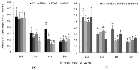 The chymotrypsin-like enzyme activity in midgut of larvae among the different treatments as well as the control is shown in Figure 6. In the treatment groups, chymotrypsin-like enzyme activity decreased as the larvae transformed from 2nd instar stage to 4th instar stage, and increased again at 5th instar stage with BTH-2 and BTH-3 application (Figure 6A). At 2nd, 3rd and 4th instar stage, chymotrypsin-like enzyme activity generally decreased below the control treatment; however, a reverse observation was made at 5th instar stage, except for BTH-2 treatment which recorded a slight decrease in chymotrypsin-like enzyme activity. There was; therefore, no significant difference in chymotrypsin-like enzyme activity in midgut of larvae at the various larvae instar stages when treated with BTH treatments (Figure 6A). Just like BTH, BABA treatments application at different concentrations did not have any significant effect on chymotrypsin-like enzyme activity in midgut of larvae (Figure 6B).