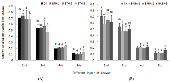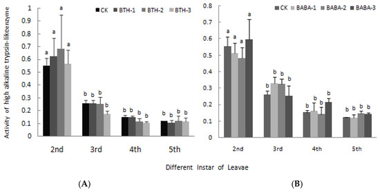 The effects of BTH and BABA on high and low alkaline trypsin-like enzyme activity are presented in Figure 7 and Figure 8 respectively. BTH and BABA application did not result in any significant difference in high alkaline trypsin-like enzyme activity. However, high alkaline trypsin-like enzyme activity was high in 2nd instar larvae and low in 5th instar larvae in both BTH and BABA treatments, except for BABA-2 in 5th instar larvae (Figure 7). Generally, application of BTH and BABA treatments at various concentrations did not affect low alkaline trypsin-like enzyme activity, except for the individual data at 2nd and 3rd instar stages (Figure 8). However, low alkaline trypsin-like enzyme activity was dependent on stage of instar larvae, in the order 2nd > 3rd > 4th > 5th for both BTH and BABA treatments (Figure 8). There was; therefore, no significant difference in both high alkaline trypsin-like enzyme activity and low alkaline trypsin-like enzyme activity upon BTH and BABA treatments (Figure 7 and Figure 8).