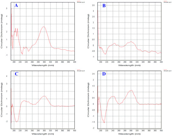 The CD spectra of compounds 2–5. (A for compound 2, B for compound 3, C for compound 4 and D for compound 5).