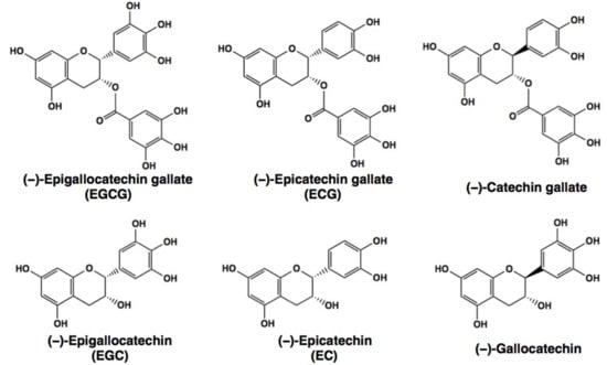 Green tea has been shown to have beneficial effects on many diseases such as cancer, metabolic syndrome (MetS), inflammatory diseases, and neurodegenerative disorders [,,,,,,]. The green tea component, (−)-epigallocatechin-3-O-gallate (EGCG, Figure 1), is believed to be a major contributor to these effects. Several human observational and intervention studies have demonstrated that consumption of green tea/catechins has favorable effects on a variety of diseases. For example, daily treatment of volunteers with high-grade prostate intraepithelial neoplasia with total of 600 mg green tea catechins (GTCs)/day for one year resulted in a 90% reduction of the prostate cancer risk as compared to the placebo groups []. It should be noted that a standardized green tea polyphenol preparation has been approved by the U.S. Food and Drug Administration as a medication to treat genital warts [].