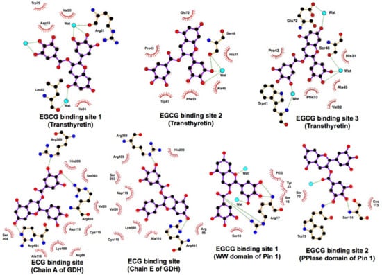 As already mentioned, in neurodegenerative diseases such as AD and Parkinson’s disease, aberrant amyloid fibril formation is associated with protein misfolding. Familial amyloid polyneuropathy is a disease caused by a point mutation of transthyretin (TTR), a transporter of thyroxine. Amyloid fibrils derived from TTR variants contribute to the pathogenesis of amyloidosis. EGCG has been shown to bind to TTR and suppress the amyloid fibril formation. Miyata et al. investigated the crystal structure of the complex of EGCG-TTR mutant with V30M and found novel binding sites distinct from the thyroxine binding site [] (Figure 4). EGCG induced the oligomerization and monomer suppression in the clinical variants of TTR. These findings suggest that EGCG may be a candidate therapeutic compound for familial amyloid polyneuropathy.