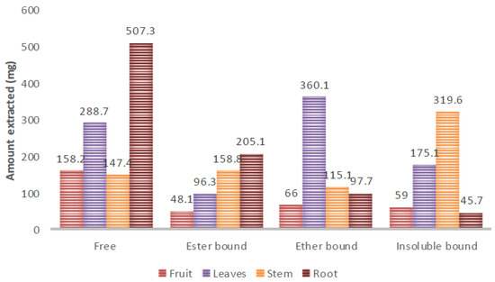 The result of the extraction yield is illustrated in Figure 1. Aqueous ethanol was used as the extracting solvent for extractable phenolic, so as to increase the extraction of very polar phenolics [42]. In general, the highest yield was found in the free phenolic root extract while the least yield was found in the insoluble phenolic root extract. Other studies have indicated that extractable (soluble) phenolics contain higher yields compared to non-extractable or bound phenolics [21,43], soluble or extractable phenolics have higher yields than bound or non-extractable phenolics. The root had the highest free and ester bound phenolic extract yield while the leaves had the highest ether bound phenolic extract yield and the stem had the highest insoluble bound phenolic extract yield. This result has indicated that there are more extractable phenolics in the root and leaf compared to the fruit and stem. However, the stem contained more non-extractable phenolics compared to the fruit, leaf, and root. While free phenolic acids contributed more to the extractable phenolics in the root, ether bound phenolics contributed more to the extractable phenolics in the leaf.