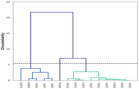Agglomerative hierarchical clustering is a multivariate analytical tool used to cluster samples based on dissimilar characteristics and then displayed as a dendrogram [48,49]. The dendrogram (Figure 2) was constructed by Euclidean Pythagorean distance dissimilarities with Ward’s Method of linkage [50,51]. Dotted lines represent automatic (entropy) truncation [49].