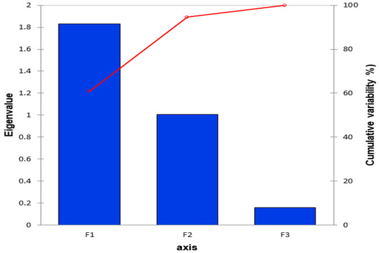 The Principal Component Analysis is an unsupervised method used to identify the patterns and grouping within a data set based on the highest variation within the data [52]. The scree plot (Figure 3) presented 3 factors, however, only F1 and F2 were significant to explain 96% of the variations. A biplot illustrating the PCA correlation and score scatter plot is presented in Figure 4.