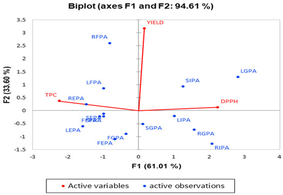 Along negative F1, REPA, and LEPA were the farthest samples from the center. The highest total phenolic contents (Table 1) were found in both samples. Free and ester bound phenolics contained higher phenolics and exhibited higher antioxidant activities compared to the glycosides and the insoluble phenolics. This trend explains the negative relationship between TPC and DPPH (r = −0.828). Previous studies have reported on the correlation between TPC and DPPH antioxidant activities [53,54]. The variation in the extraction yield is explained along F2. Positive F2 consists of RFPA, LFPA, SIPA, LGPA, and REPA. The highest extractable phenolics were found in leaves and root while the highest non-extractable phenolics were found in the stem. Although LGPA had a high extraction yield, it displayed a poor antioxidant activity. The same trend was found with SIPA. On the other hand, the extraction yield and antioxidant activity (low IC50 values) of RFPA, REPA, and LFPA were high. This trend explains why there was no correlation between DPPH and extraction yield. Although FIPA was not included in the constructing the PCA model, it contained the least phenolic content and antioxidant activity.